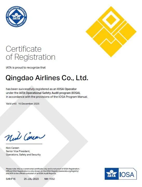 (图为青岛航空IOSA注册证书)
